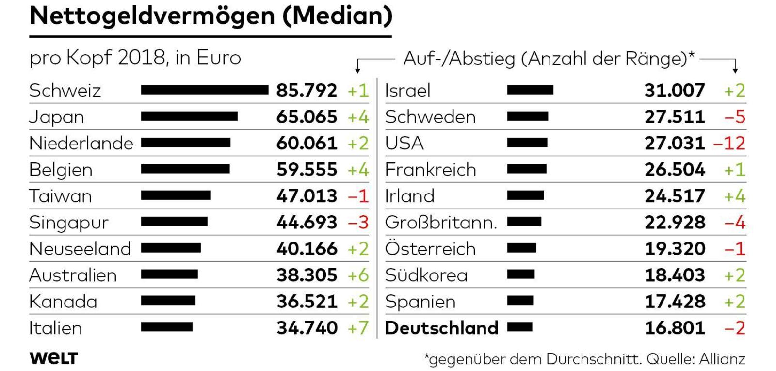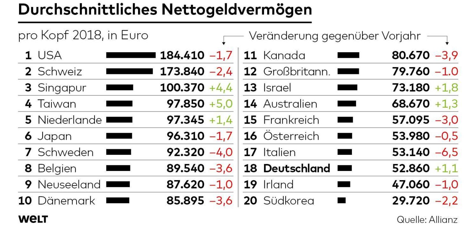 Was sehen wir hier? Deutschland liegt im internationalen Ranking beim durchschnittlichen Nettogeldvermögen auf Rang 18 mit knappen 53.000 Euro.