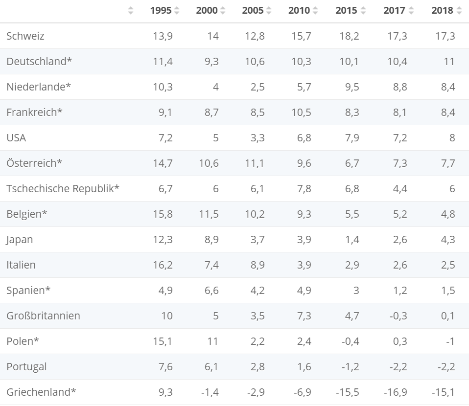 Bei der Sparquote liegen wir seit Jahren in der weltweiten Spitze. Schaut man sich den Verlauf seit 1995 an, sparen wir fast in jedem aufgeführten Jahr prozentual mehr unseres verfügbaren Einkommens als die Vergleichsländer Niederlande, USA und Japan.